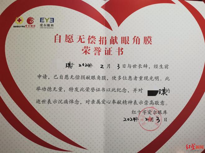 琪琪去世后,其父母将其眼角膜捐献,红十字爱尔眼库颁发了《自愿无偿捐献眼角膜荣誉证书》。该证书称,琪琪于2024年2月3日与世长辞,其无偿捐献的眼角膜,使多位患者重见光明。