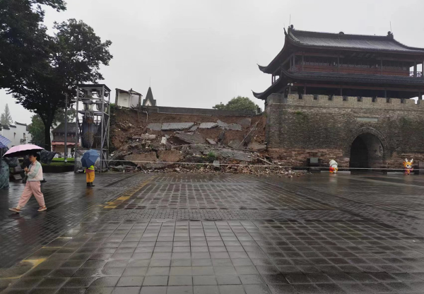 受持续强降雨影响,浙江衢州水亭门城墙北段西侧6月26日凌晨局部坍塌,现场无人员伤亡或被困。据衢州市文化广电旅游局26日上午发布的情况通报,坍塌区域周围已设置安全警戒线,正组织专家评估坍塌情况。