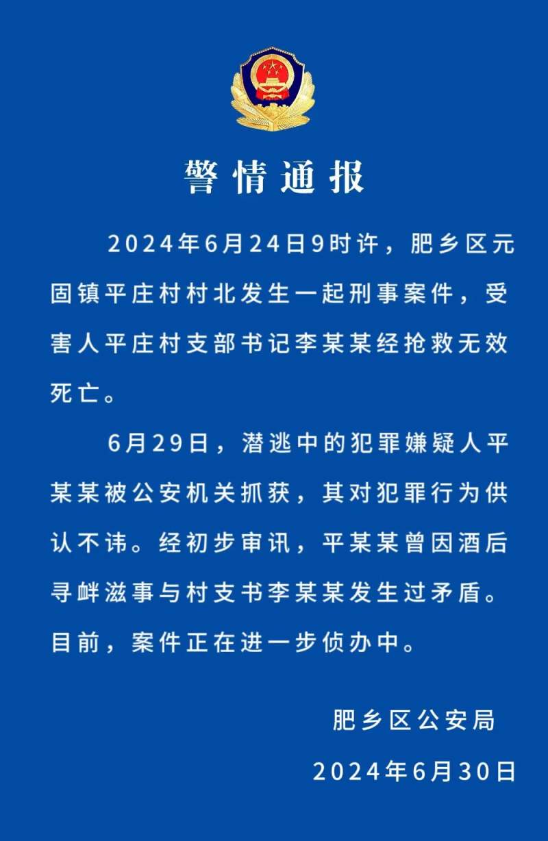 6月29日,潜逃中的犯罪嫌疑人平某某被公安机关抓获,其对犯罪行为供认不讳。经初步审讯,平某某曾因酒后寻衅滋事与村支书李某某发生过矛盾。目前,案件正在进一步侦办中。
