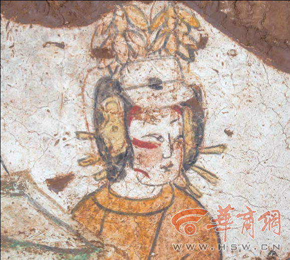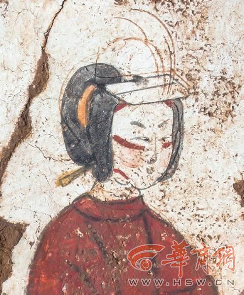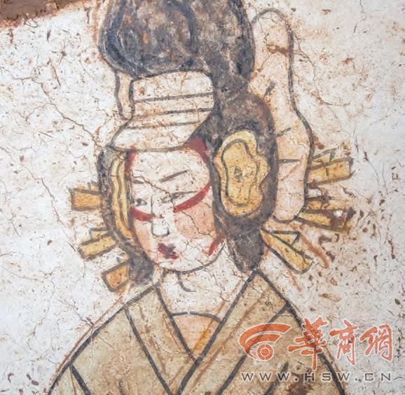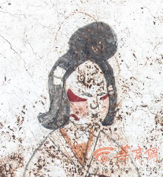 位于壁龛北侧的侍女图上,两侍女均面向墓室侧立。南侧女子头饰倭堕髻,面绘斜红妆,身着交领白底宽袖襦,袖口有赭红和粉红色折角纹样,黄色内衬,下为黑色曳地长裙。北侧女子头饰抛家髻,髻前插有一象牙色梳,发下插一黄色发簪,面绘斜红妆,身着赭红色圆领长袍,明黄色内衬,腰系明黄色腰带,身体略微弯曲。