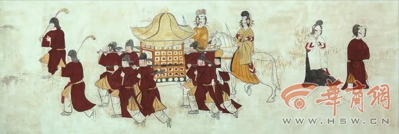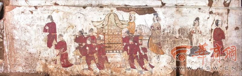 西壁壁画也可分为两幅:壁龛南侧为抬担出行图,由自南向北由引路童子图、八人抬担图、骑马仕女图组成;壁龛北侧为侍女图。