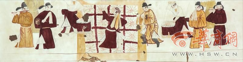 墓室东壁为乐舞图,由十人组成,画面以抬袖女舞者及右侧持钹舞者为中心,其他乐手于左右两侧对称分布。