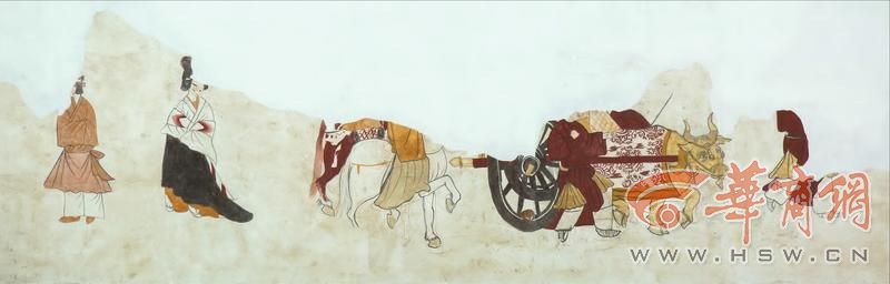 牛车图牛车仅残存下部,牛为双角黄牛,车为两轮车,车轮为黑色,车軎为黄色,车尾为金色铜饰。车前两侧各有一人。