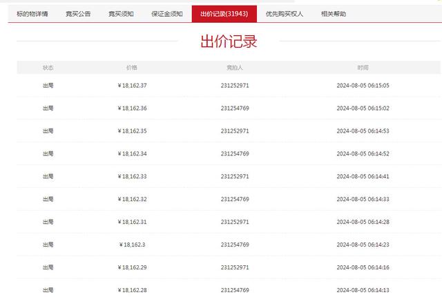 从1元起开始变卖,经历了2天多的竞价,2024-08-05 06:10:13竞价结束时,本次司法变卖的延迟次数高达31674次。