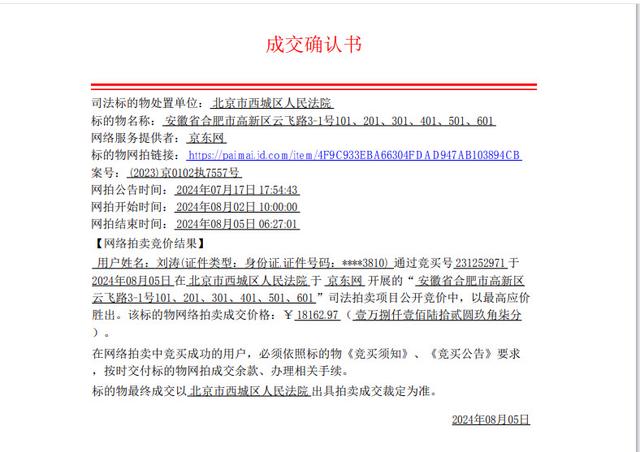 大皖新闻讯 建筑总面积9550.64平方米、市场价为1.3亿元的厂房,被1元钱变卖,最终变卖成交价仅有1.8万元,每平方米房价不足2元—— 2024年8月5日,北京市西城区人民法院变卖的一个价值1.3亿元的厂房变卖成交。成交确认书显示,这位幸运的“捡漏”者是一位名叫刘涛的自然人,以18162.97元的最高价竞价成功这个价值1.3亿多元的标的。