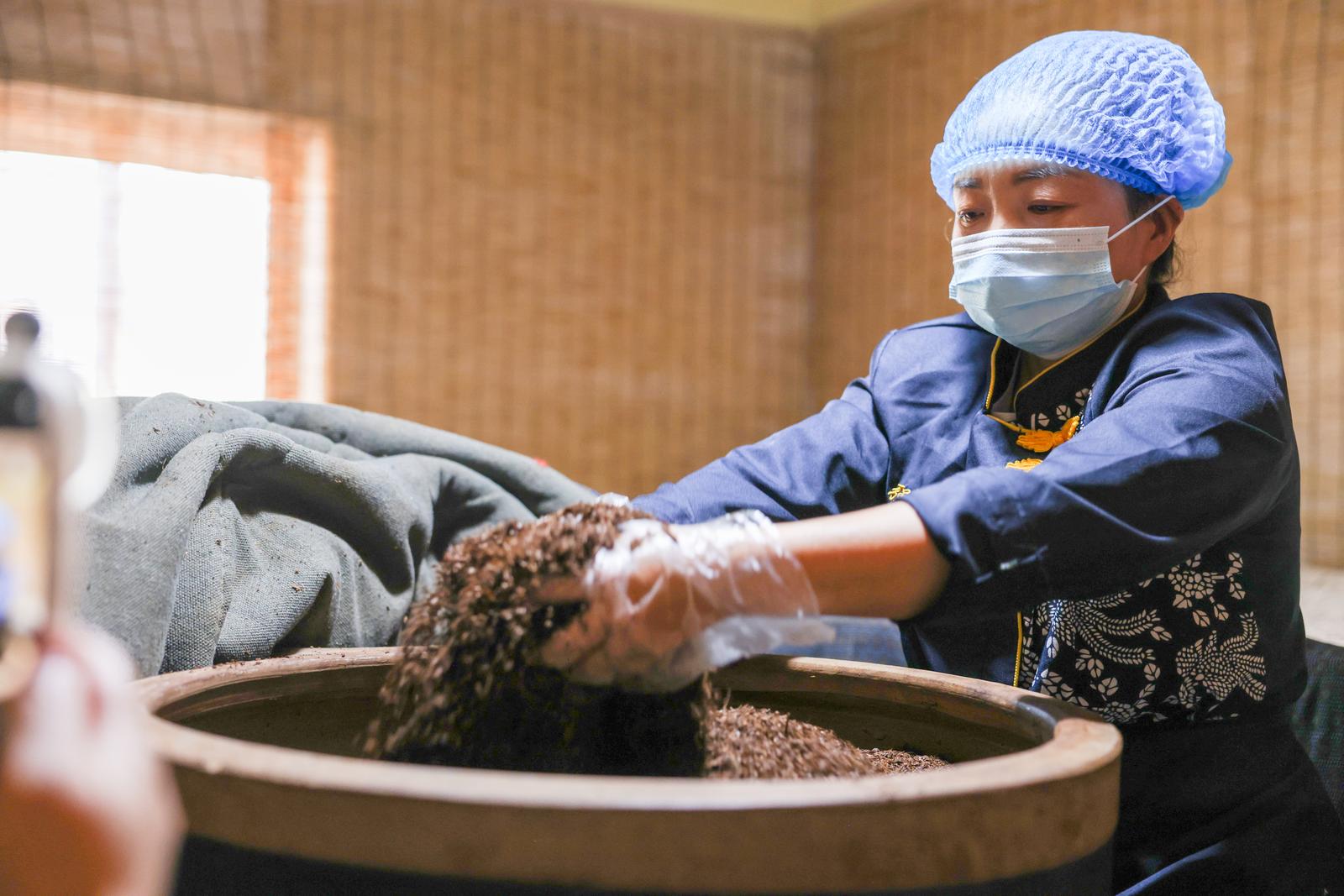 强家老醋文化养生园工作人员正在搅拌酿醋的豆类粮食原料。