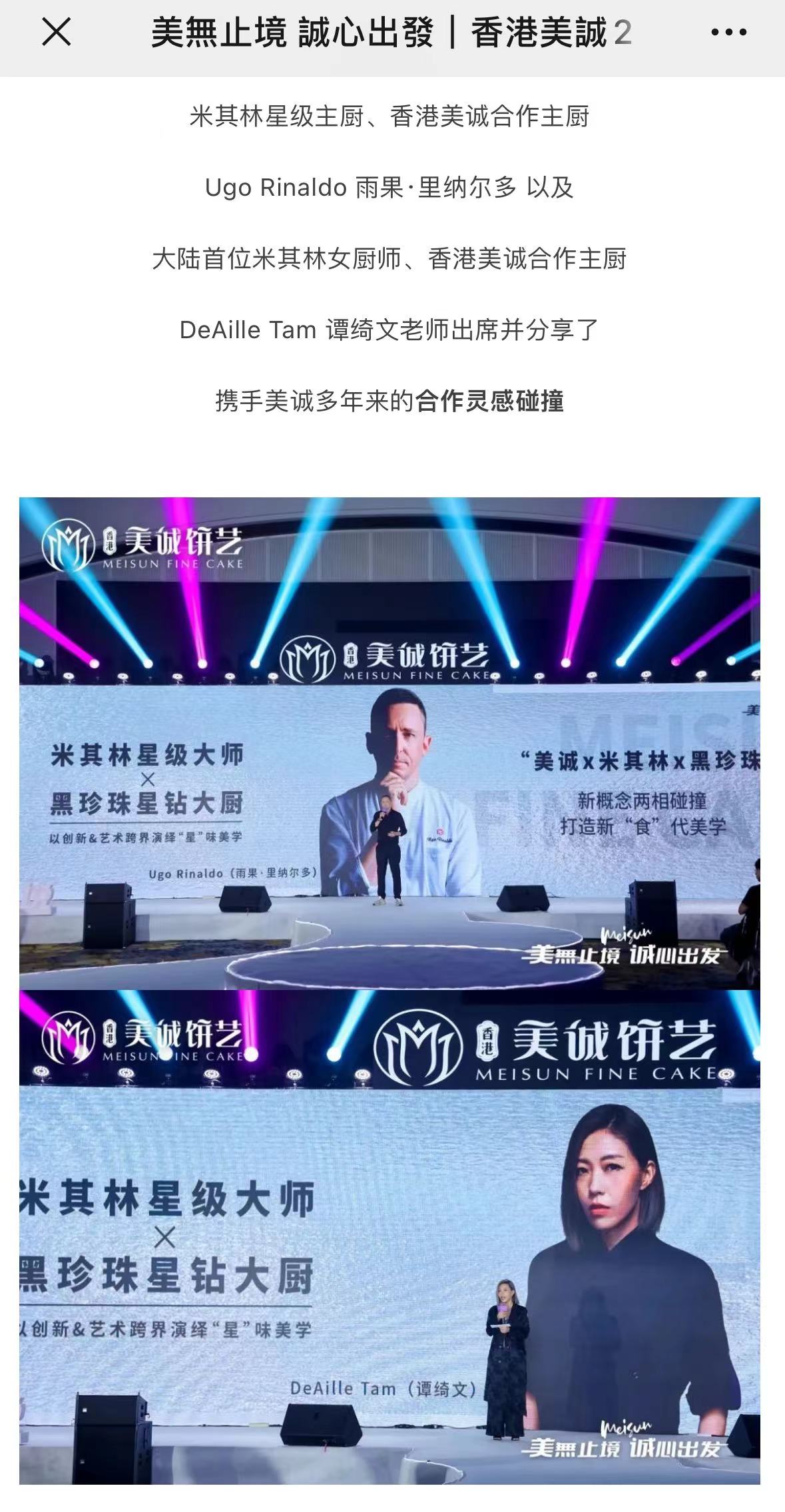 澎湃新闻注意到,2024年7月1日,广州市美诚食品有限公司在其官网发布了“香港美诚2024年中秋新品发布会暨五周年盛典”相关信息。其中提到,米其林星级主厨Ugo Rinaldo雨果·里纳尔多以及大陆首位米其林女厨师DeAille Tam谭绮文出席活动,二人系香港美诚合作主厨。