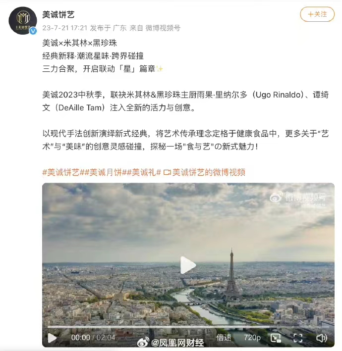 此前有媒体报道,美诚月饼官方微博@美诚饼艺 曾在2023年7月21日宣布与两位米其林主厨达成合作。当时的宣传内容为:美诚2023中秋季,联袂米其林&黑珍珠主厨雨果·里纳尔多(Ugo Rinaldo)、谭绮文(DeAille Tam)注入全新的活力与创意。