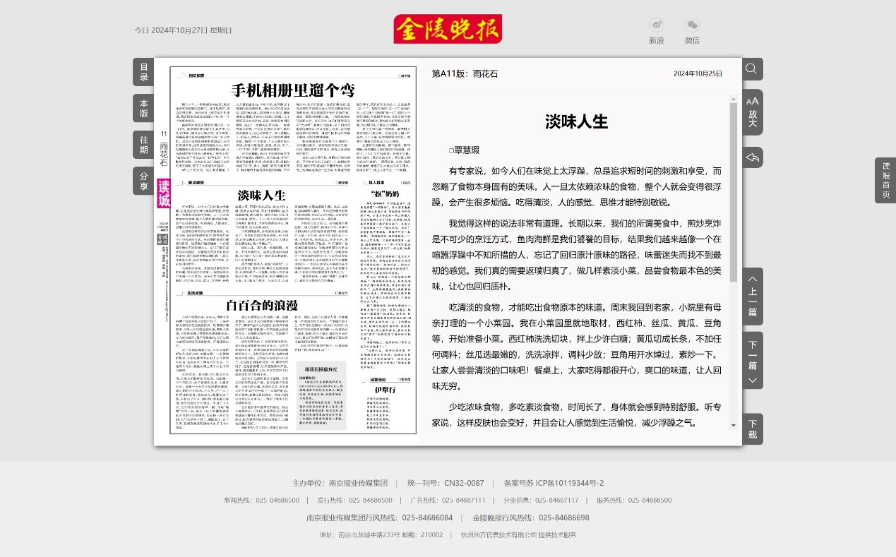 2024年10月25日,《金陵晚报》在“雨花石”副刊版刊发了署名为“覃慧瑕”的文章《淡味人生》。