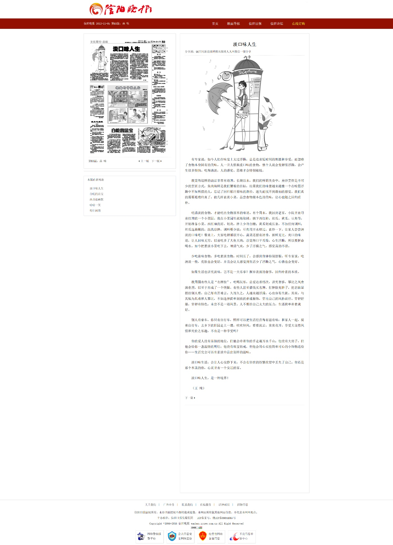 《信阳晚报》在2012年11月5日以《淡口味人生》为题发表署名 “王纯”的文章