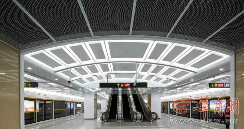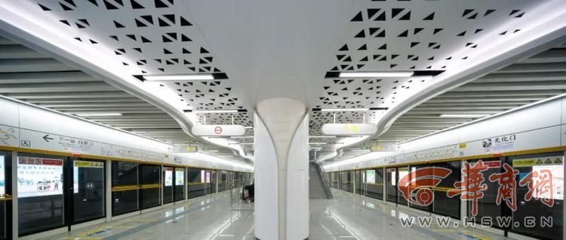 井上村站是8号(环)线与10号线的换乘车站,车站以“霞光汇萃、璀璨而归”为设计主题,提取交汇、渐进菱形的曲线动感设计元素,巧妙运用具有强引导性的天花造型,营造简洁现代、清晰明亮的交通换乘空间。