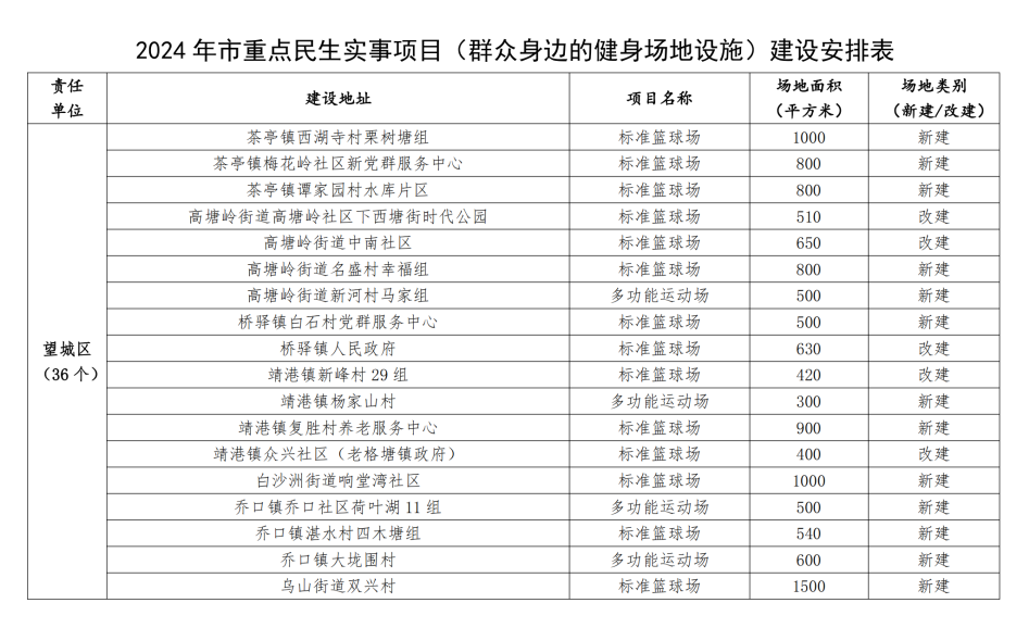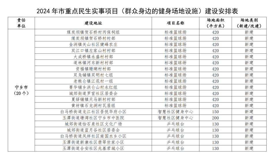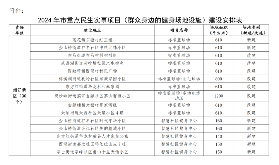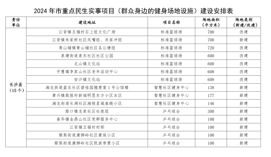 这200个场地分布为湘江新区30个、芙蓉区18个、天心区18个、开福区18个、雨花区18个、望城区36个、长沙县15个、浏阳市27个、宁乡市20个,超过八成的场地为新建。