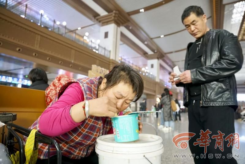 上午10点多,候车大厅里人来人往,基本座无虚席。人群中,一位中年女子引人注目,她趴在两个叠放的涂料桶上,正在吃着康师傅方便面,旁边座位上,放着一堆大包小包。