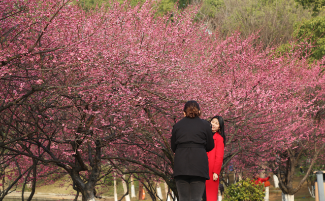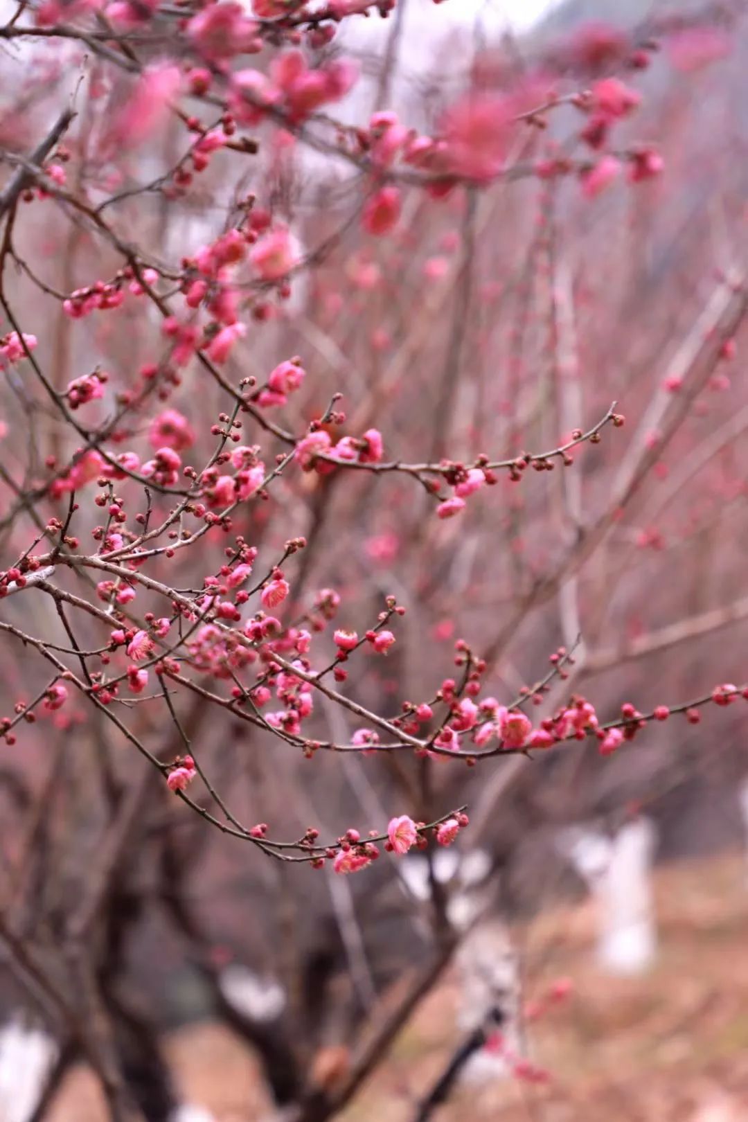 面积30亩,或黄或白,色彩缤纷,各种梅花或粉或红,形态各异。