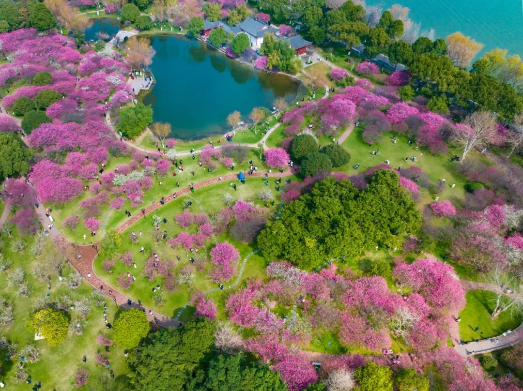 以梅花为园花。大量梅花巧妙分布在公园各个角落。小径旁、湖边、草坪上,都能见到梅花的身影。