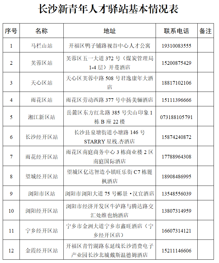 答:长沙目前有12家新青年人才驿站。各驿站联系地址及联系方式如下表:
