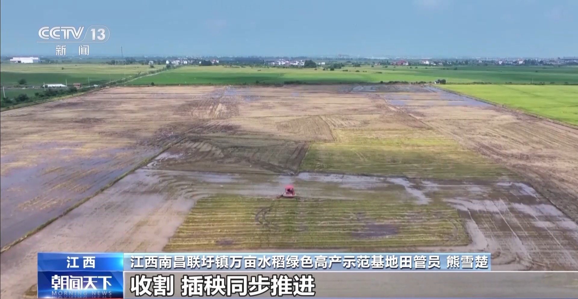 江西南昌新建区联圩镇万亩水稻绿色高产示范基地田管员 熊雪楚:我们基地6000多亩的早稻和晚稻,收割、插秧同步推进,上百台机械同时作业,用两个星期就可以全部搞完,效率比人工高多了。