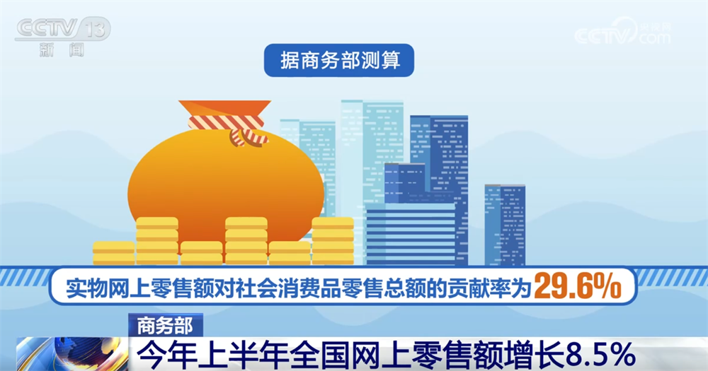 据商务部测算,实物网上零售额对社会消费品零售总额的贡献率为29.6%,在线餐饮占餐饮收入比重增长1.9个百分点,可数字化交付的服务进出口平稳增长。
