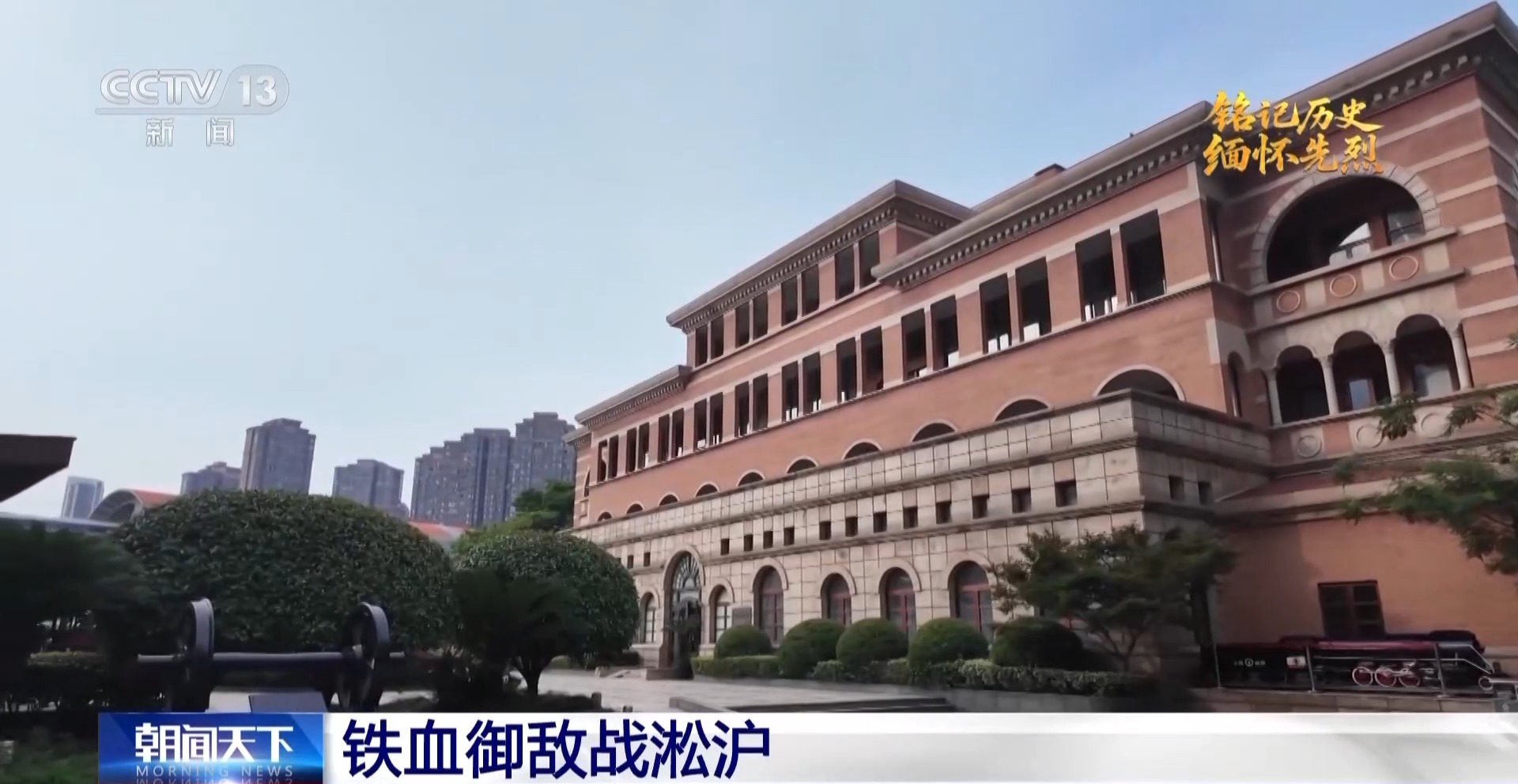 总台央视记者 赵坤现:上海宝山区的“一·二八”抗战纪念广场,绿地上的三座纪念塔,全部由钢铁焊制而成,意喻中国人民保卫国家坚不可摧的钢铁意志。纪念塔的侧面,是张治中将军撰写的碑文:回忆尸填蕴藻、血染江湾凄恻战区,涕泪横流愧后死;遥睇叛据白山、敌侵黑水凌夷祖国,戴天不共是斯仇。