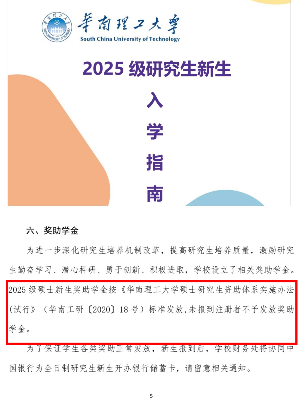 指南中“新生入学须知”第6条“奖助学金”明确2025 级硕士新生奖助学金按《华南理工大学硕士研究生资助体系实施办法(试行)》(华南工研〔2020〕18 号)标准发放。