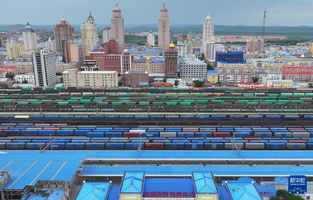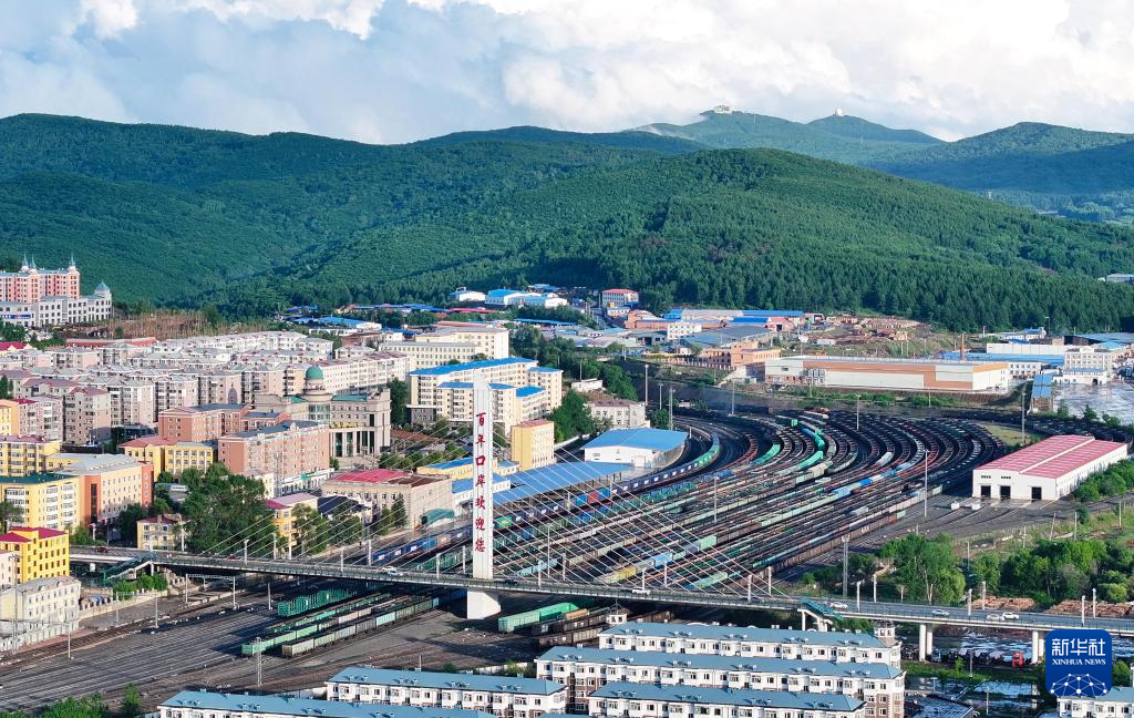 7月21日,一列满载家用电器的中欧班列驶出中国铁路哈尔滨局集团有限公司绥芬河站(无人机照片)。