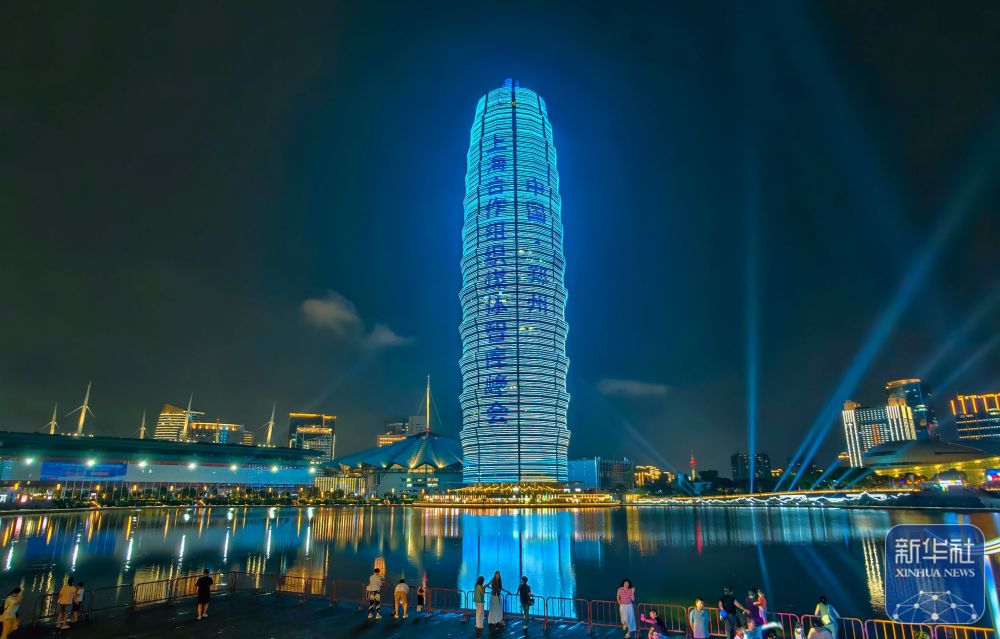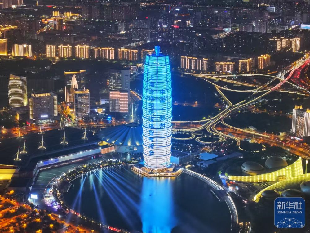 ↑ 7月23日晚,郑州国际会展中心旁的千玺广场主楼亮灯宣传上海合作组织媒体智库峰会。郑州国际会展中心是峰会举办地。新华社发(谷雨 摄)