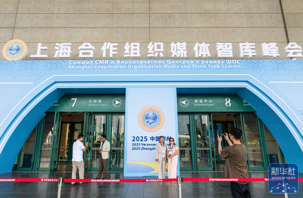 ↑ 7月24日,在河南郑州举行的上海合作组织媒体智库峰会会场外,与会代表合影留念。新华社记者 伍婧丹 摄