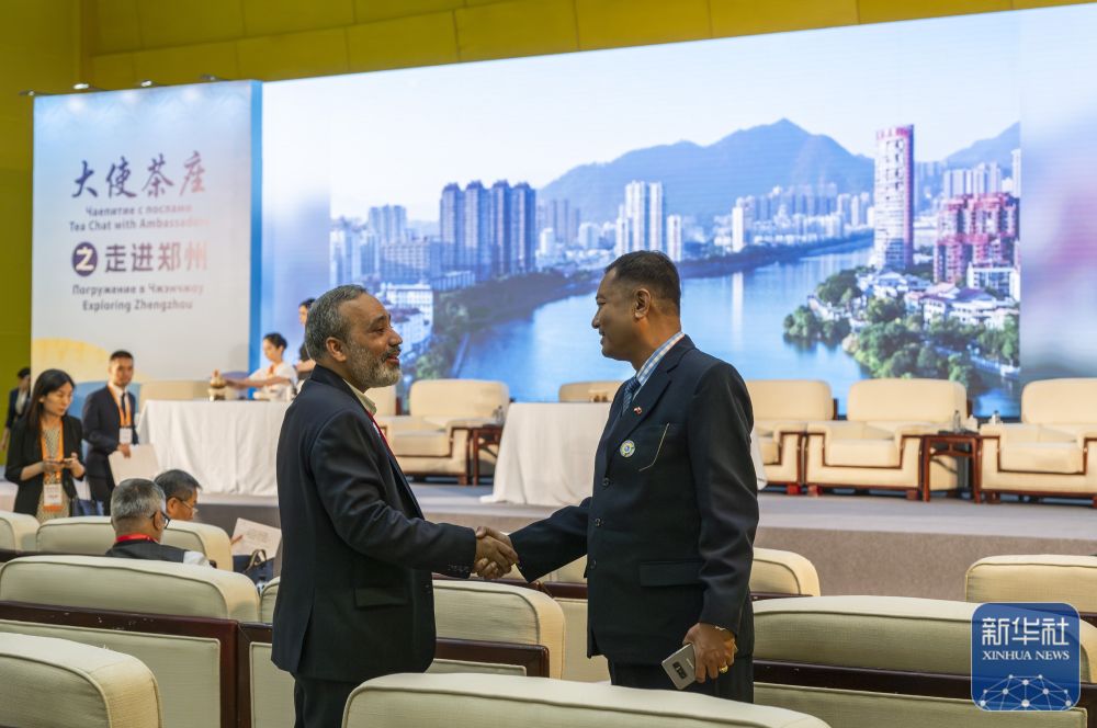 ↑ 7月24日,在河南郑州举行的上海合作组织媒体智库峰会会场,与会代表握手寒暄。新华社记者 傅天 摄