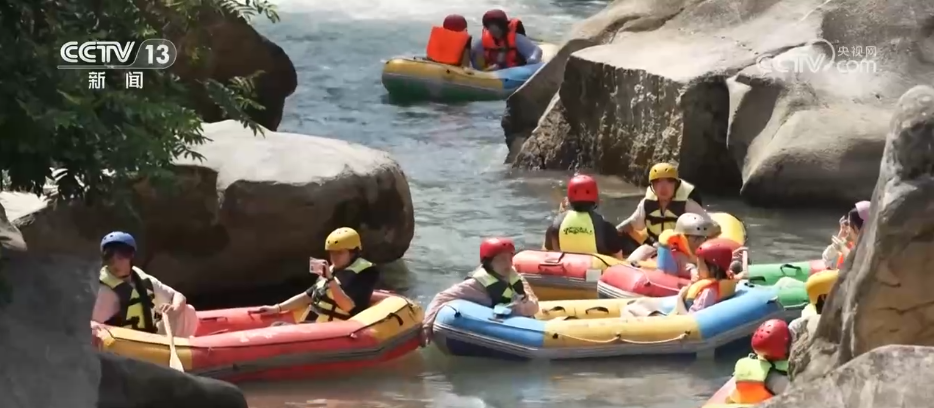 烈日炎炎的暑期,望仙谷内却是一片清凉欢腾。在花岗岩河道形成的漂流区域,游客们身着救生衣,乘坐皮划艇顺流而下,全程欢笑声不断,清凉的水花从四面八方袭来。