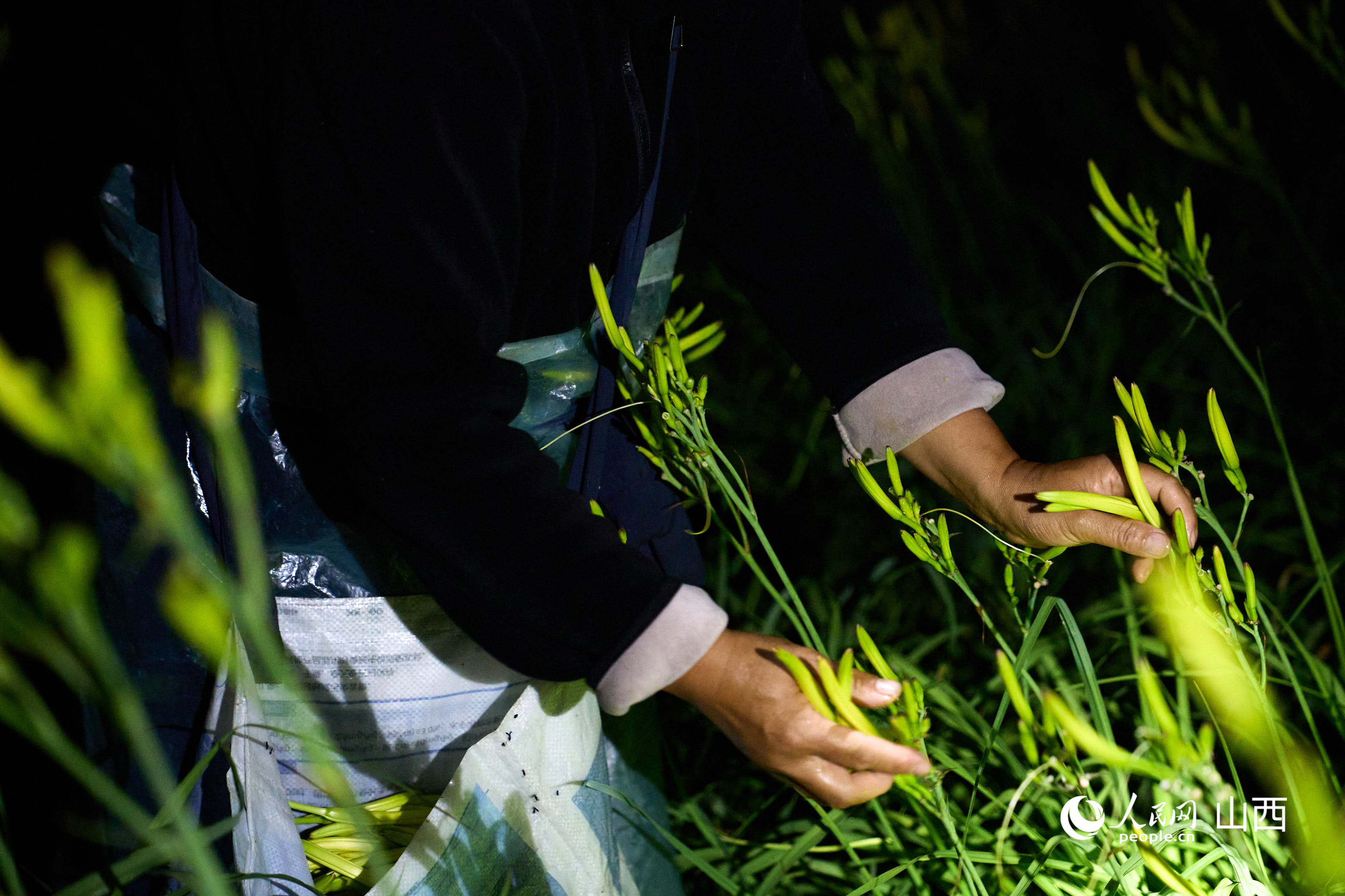 “选哪朵黄花摘得靠经验,是个眼力活儿,采摘时要轻、巧、细、快,不能损伤花蕾。”村民杨瑞仙一边说一边为记者示范采摘方法,只见她左手扶住花葶,右手中指一顶、食指一掰,一朵黄花便从花蒂和苔梗连接处折断。