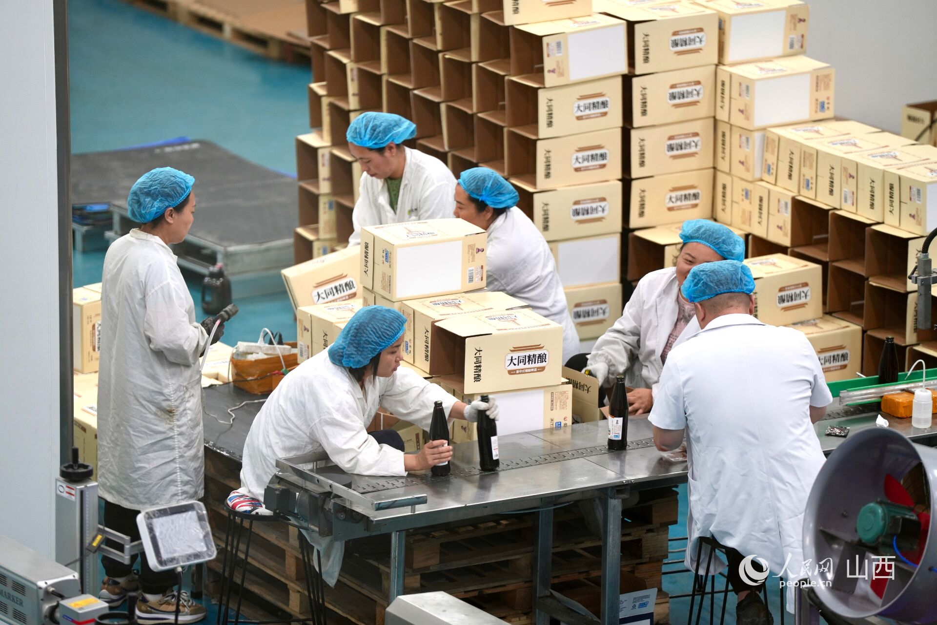 大同三利集团生产车间内,工人正在分装黄花啤酒。人民网 卢鹏宇摄