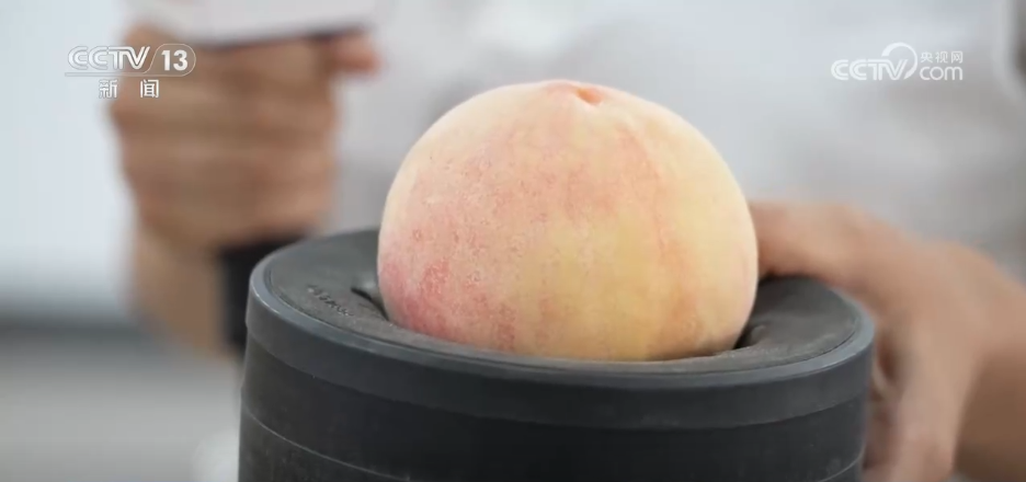 这条智能化水蜜桃分拣线上,桃子进入通道后,会被放到专门为硬度低、易损伤的水蜜桃设计的柔性果盘中,随后机器以每秒3个的速度检测每个水蜜桃的外观、重量、糖度等数据进行检测,按照不同标准将水蜜桃分为9类进行分装。这台智能化设备每小时可以检测1万个左右水蜜桃。