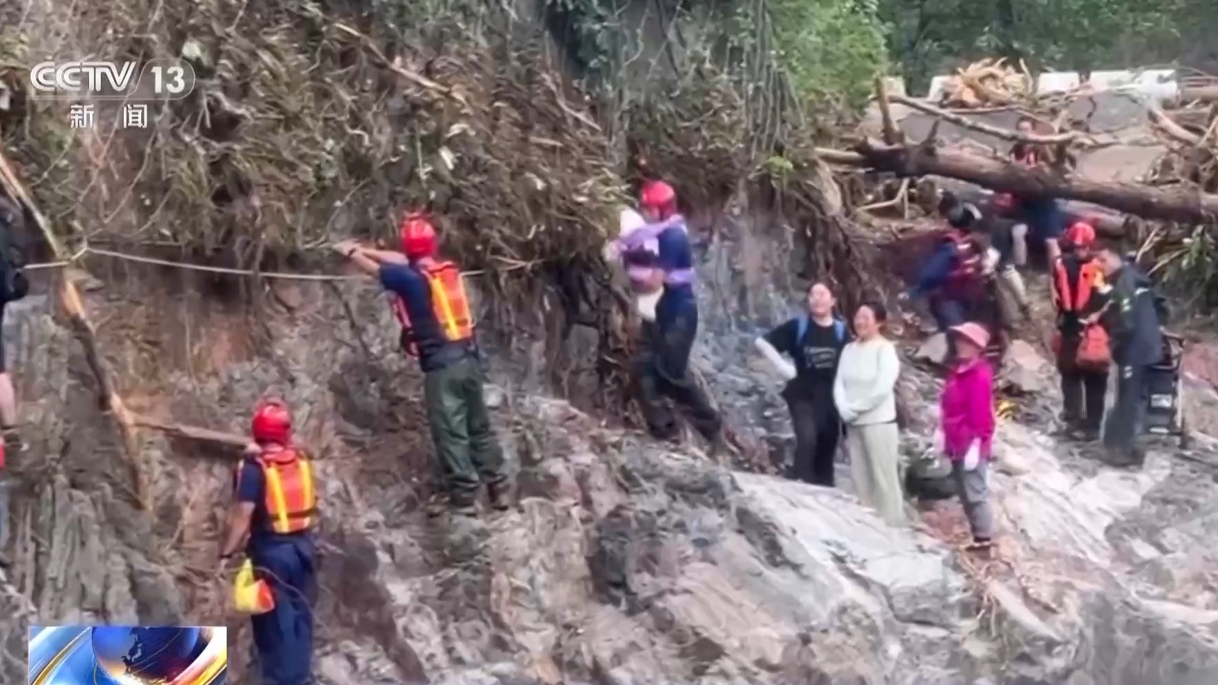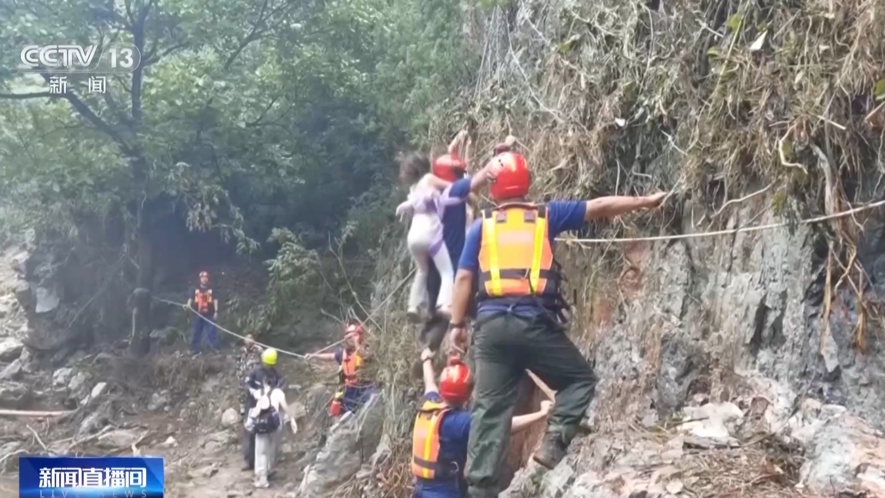 渡过断桥还有断路,这段路需要攀崖壁而行,队员们拉起绳索,有自主行动能力的被困群众,紧抓绳索,小心沿悬崖边缘艰难通行;对于行动不便的老人、儿童和伤员,救援人员将他们一个个背负过险段。