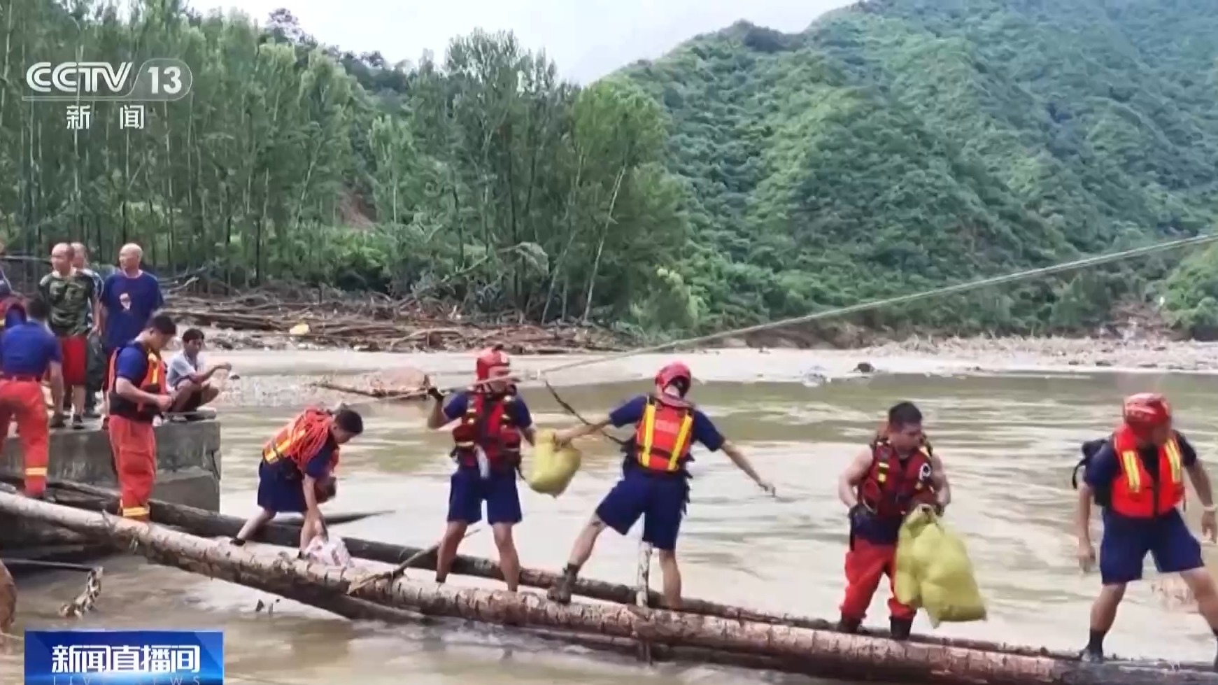 为了方便把受困人员转移出来,消防救援人员在断路处就地取材,用断木和绳索快速架起一座木桥。