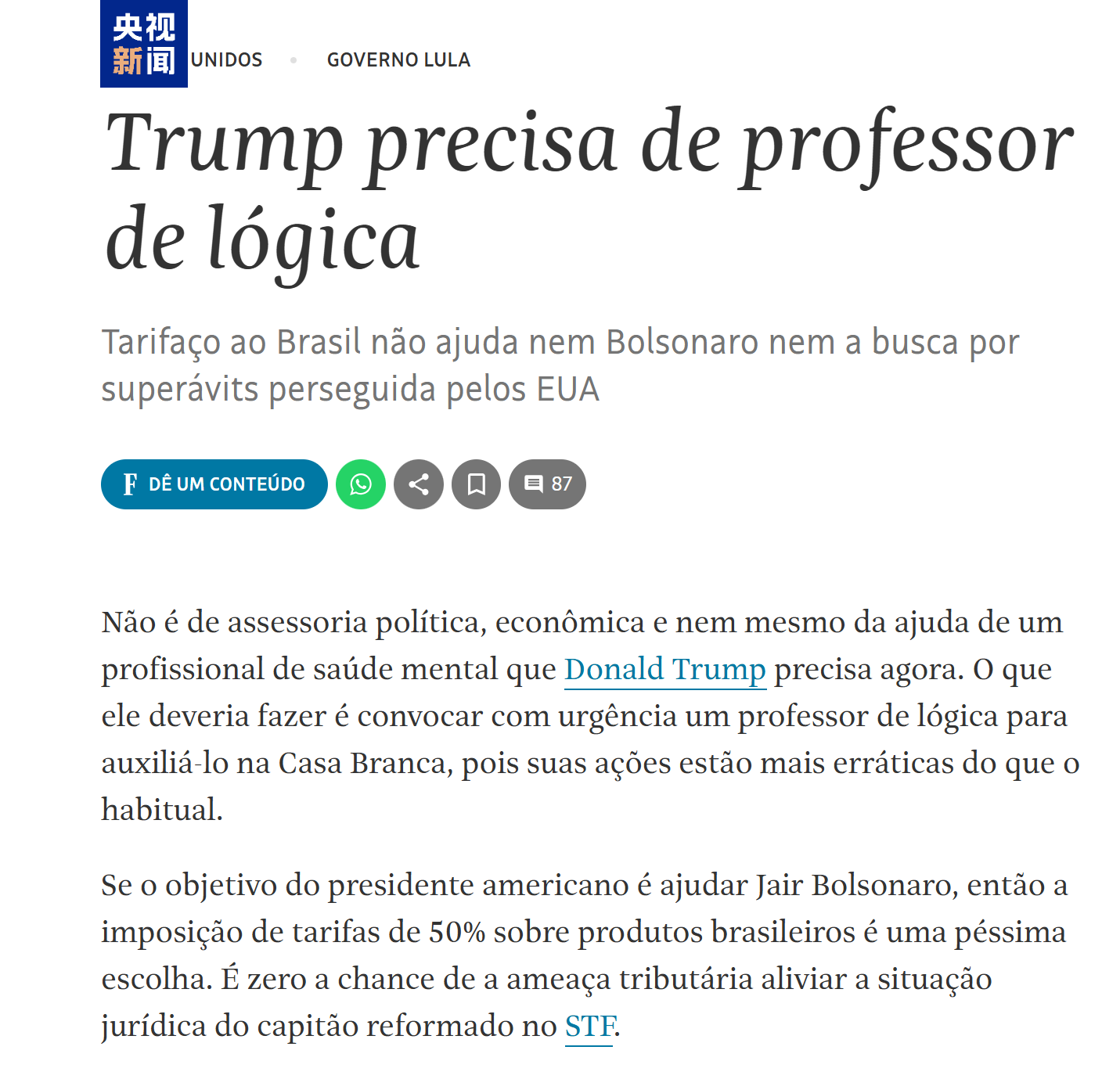 在媒体舆论层面,不同立场的主流媒体也发出一致批评。右翼保守派的《环球报》在社论中指出,此次征税将造成数十亿美元的经济损失,过度的挑衅只会加剧双边紧张局势。文章敦促特朗普政府“降低关税火力”,重启与巴西的对话渠道。社论指出,特朗普在国际关系中的常见手法是:先宣布加征高额关税,附带一系列荒谬要求,然后再提出谈判条件。但这种威胁式逻辑在巴西无法奏效。若特朗普希望取得实质进展,应首先推迟关税生效时间,并立即启动技术层面的沟通机制。