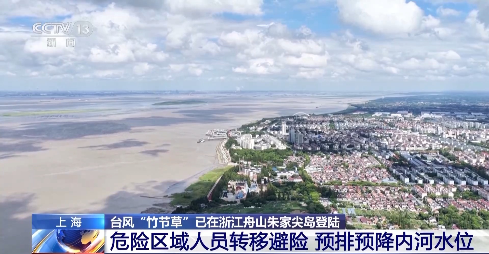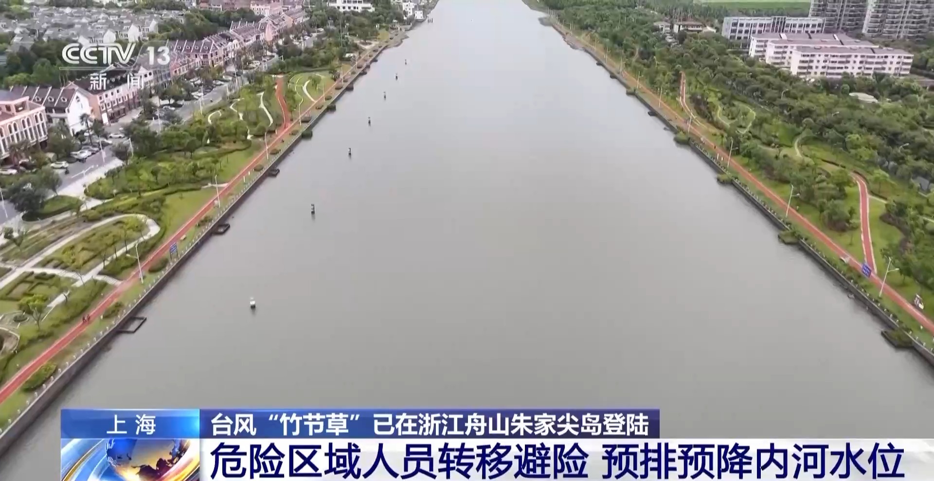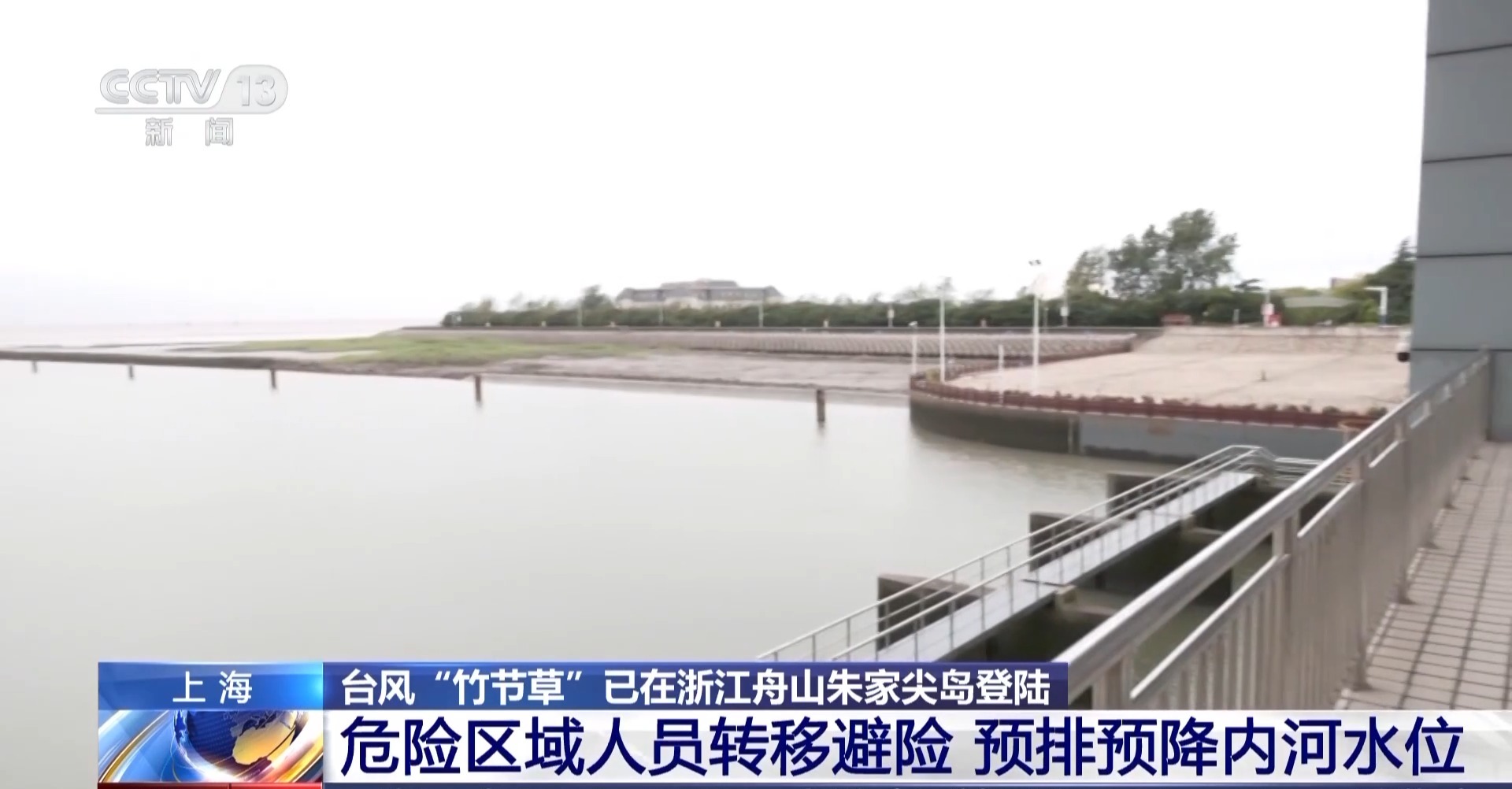总台记者张寄予:为应对台风“竹节草”,上海市奉贤区金汇港南闸会进行开闸排水工作。这里一边是内河,一边是杭州湾,当海水落潮的时候,海水水平面低于内河水平面时,就会开启闸口,利用水位落差自然排水。