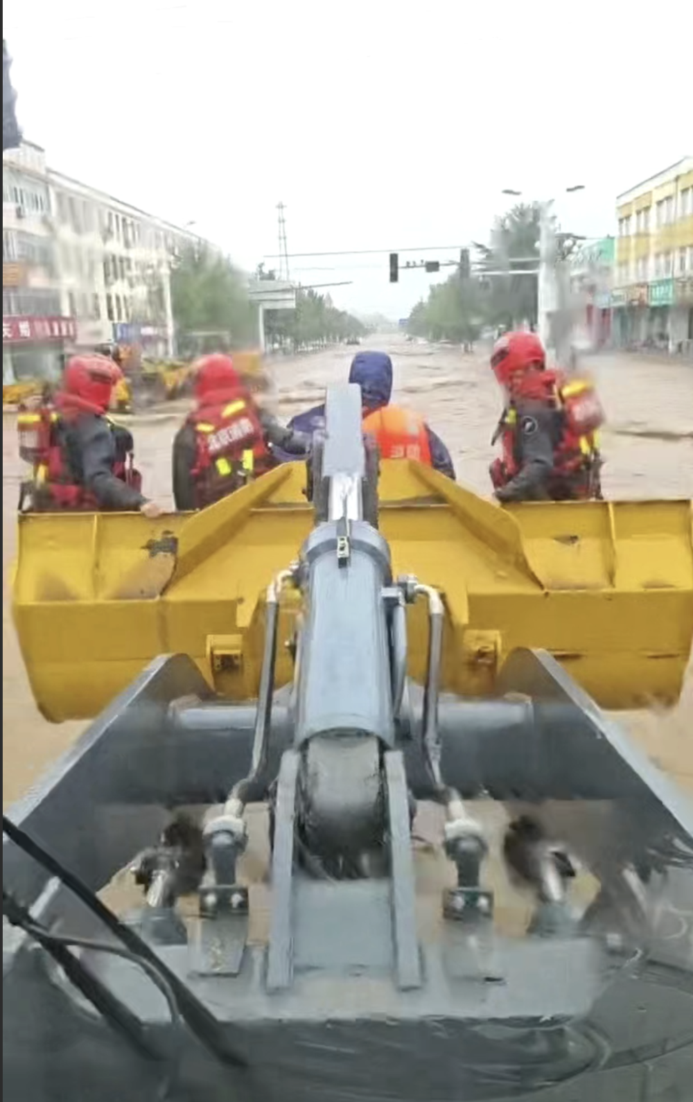 一时间,原本在工地上作业的铲车队伍,在泥流里来来往往,宛若“生命之舟”。