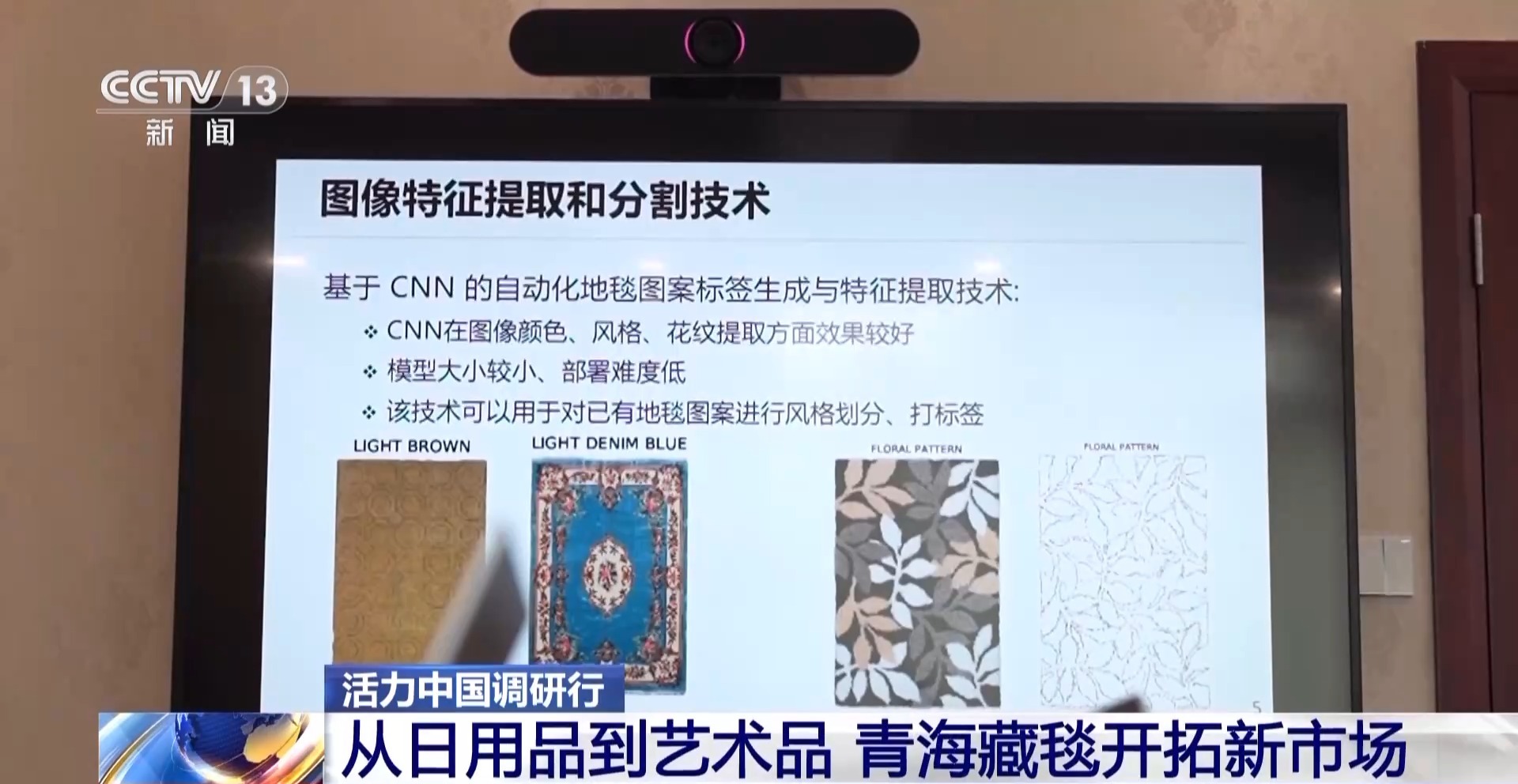 藏毯工厂的设计团队仔细研究传统藏毯的花样纹路,通过人工智能,储存了数以万计的纹样,融合现代设计元素,开发出立体纹路、闪光图案等产品。