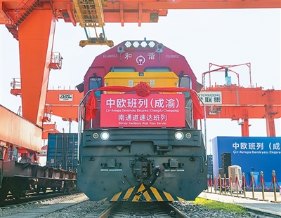 在四川省成都市青白江区的成都国际铁路港,一列中欧班列(成渝)南通道速达班列发车。白桂斌摄(人民视觉)