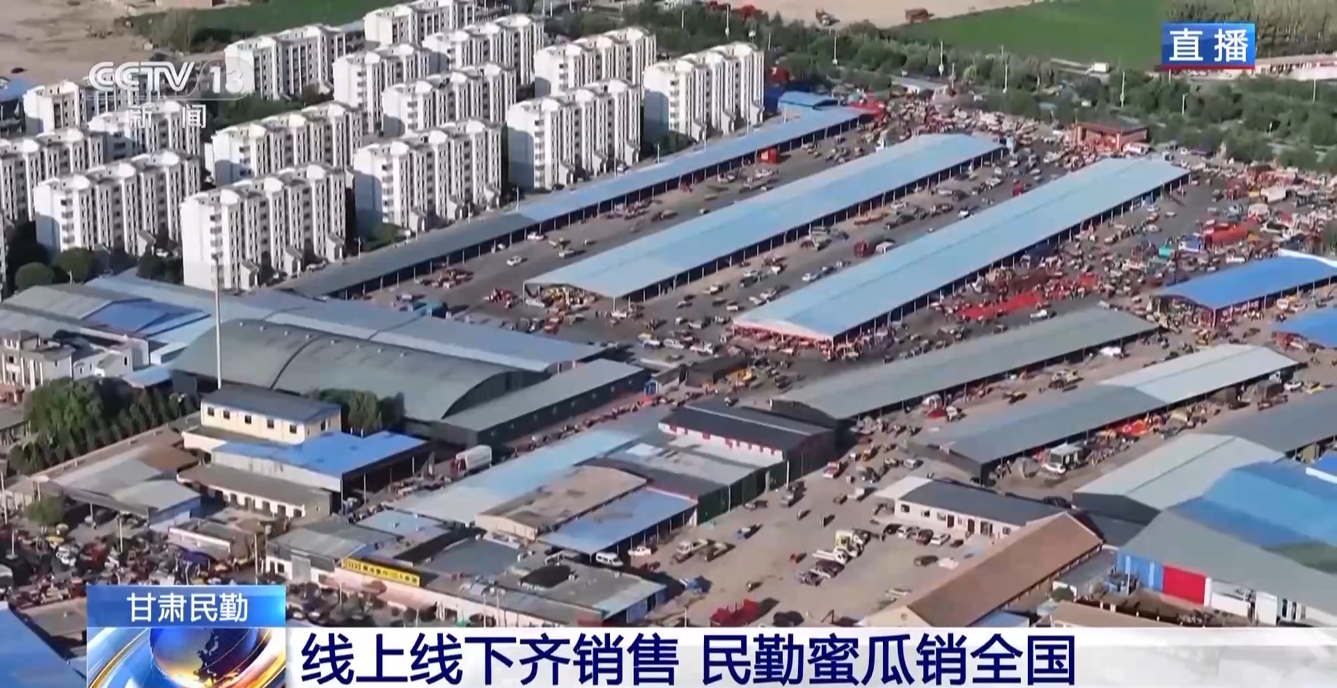 总台记者 马丽:在市场里,不仅有线下交易,还有很多线上销售平台,通过直播带货进行选购、交易。这些主播不仅有本地人,还有来自四川、陕西、河南等地的人,一个直播间一天的销量可以达到2000至2万单不等。通过线上+线下的模式,拓宽了民勤蜜瓜的销售渠道。目前,民勤蜜瓜远销国内20多个省份。