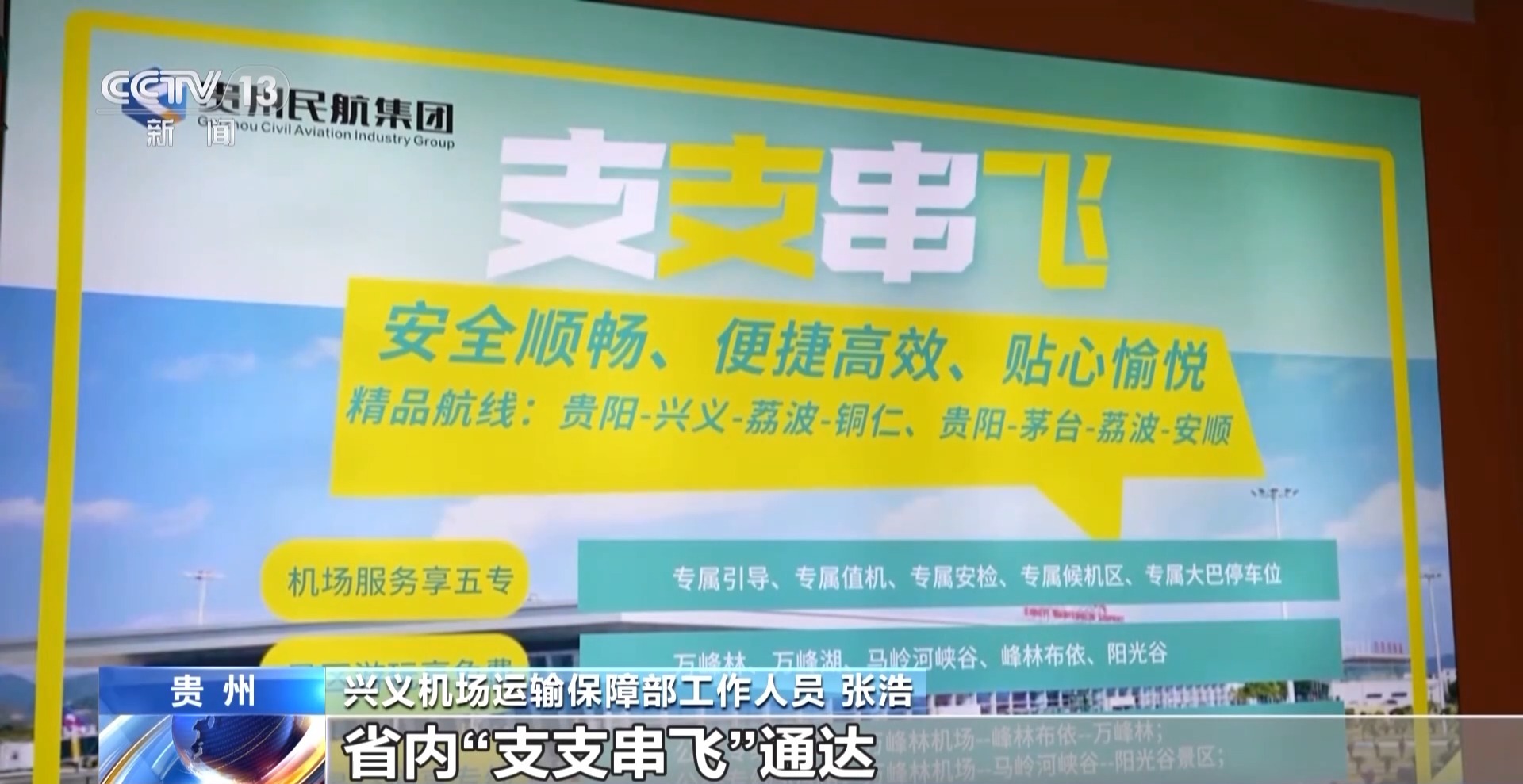 在贵州的兴义万峰林机场,记者看到了带着一家人来游玩的重庆游客罗伟。游客 罗伟:到这边真的感到非常凉快,适合避暑。我们之后还要去黄果树瀑布、梵净山。我们全程都是坐飞机,因为感觉真的非常方便。在采访中,记者发现,罗伟的旅程之所以如此高效便捷,源于贵州创新推出的“干支联动”“支支串飞”的航线组合模式,目前贵州已形成以贵阳龙洞堡干线机场为核心,以兴义万峰林、遵义新舟、安顺黄果树、铜仁凤凰等为支点的“一枢纽十支线”机场布局。通过贵阳航空枢纽与其他支线机场协作,实现干线支线联动,同时通过组合多条支线航线形成特色精品旅游线路。兴义机场运输保障部工作人员 张浩:目前21条航线覆盖21座城市,省内“支支串飞”通达铜仁、荔波、遵义茅台等航点,兴义到贵阳的“贵阳快线”保持每天3班执飞。在贵州兴义机场,记者看到了从机场至景区的专线客车,针对旅游景点分散、地面接驳时间较长等短板,贵州各地支线机场都开通了去往景区的专线客车。游客在抵达后,还可以通过“小车小团”的服务前往各个景点,省去转车等车的时间。贵州民航集团航空市场营销部航空事业规划经理 陈辰:针对暑期旅游旺季,联合多家航空公司,新开大连-杭州-贵阳、郑州-达州-贵阳、沈阳-贵阳等航线,其中大连-杭州-贵阳航线暑运期间客座率超90%。(总台记者 唐颖 王亚平 贵州台) 来源:央视新闻 相关热词搜索: