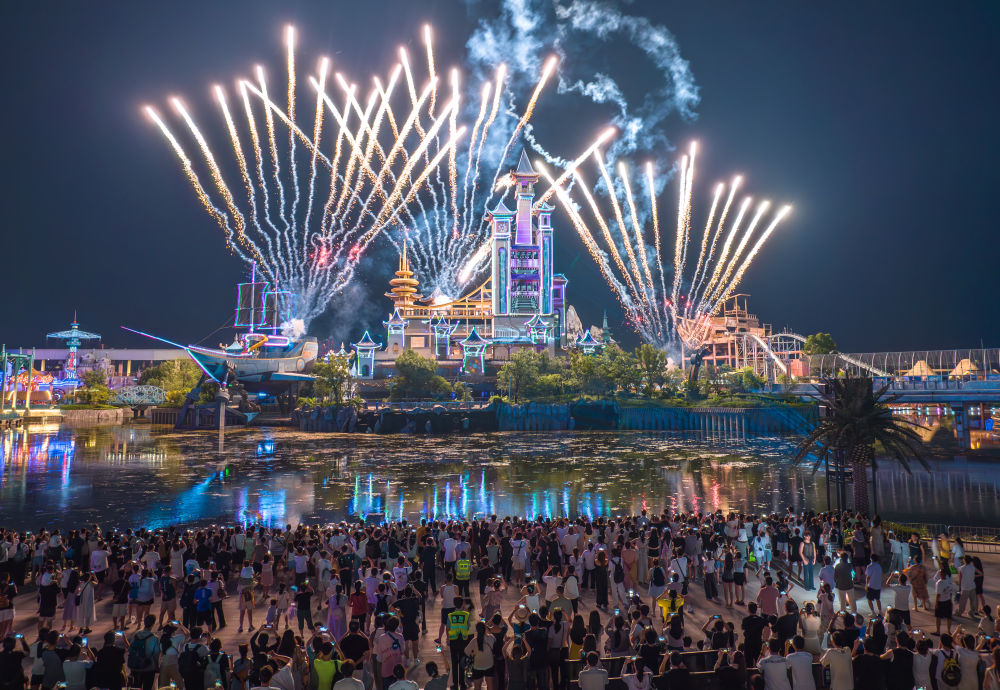 7月19日,在湖北省襄阳市华侨城奇幻谷,游客观看大型夜间演艺秀《奇幻城堡光影秀》(无人机照片)。新华社发(杨东 摄)
