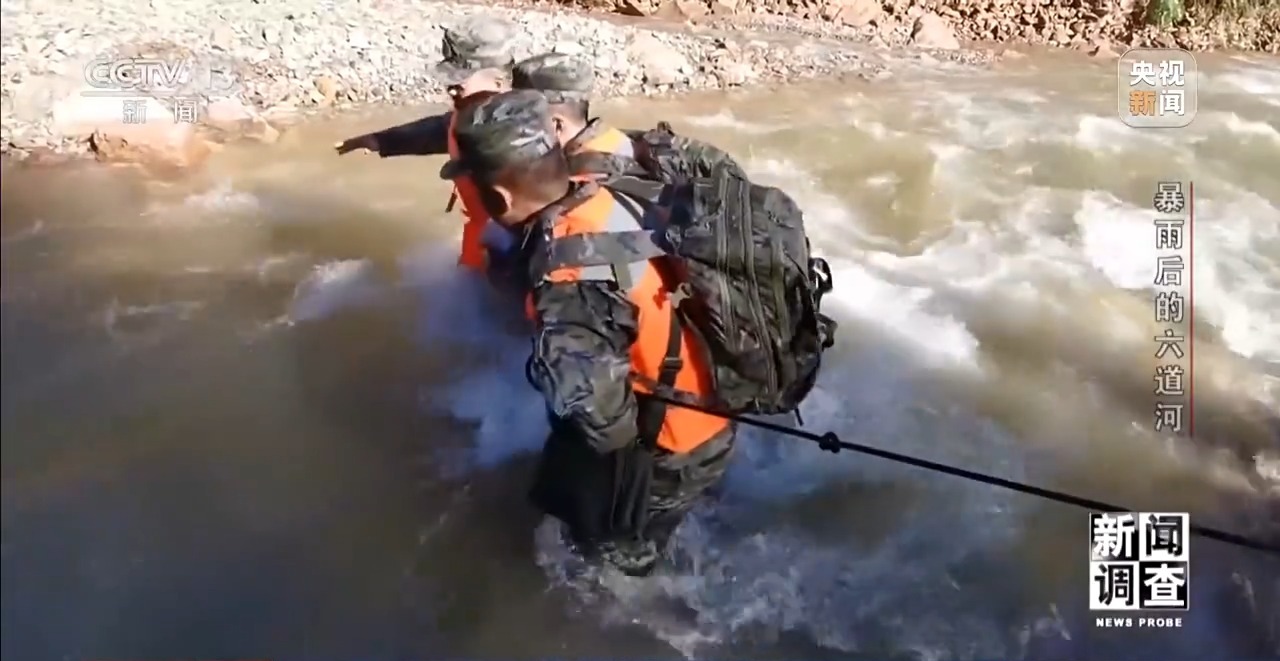 六道河镇山高谷深,行进中不时遇到大面积整段塌陷,从这里再往上,是一段曲折的沟谷,道路几乎完全被泥石流冲毁,湍急的水流拦住了几天来想要进出朱家沟村的所有人。在水中行走,远比看起来要艰难得多,由于水流速度快,水下深浅不一,几乎每走一步都要对抗水的冲击力,保持平衡,大多数的时候,队伍都是组成人墙,集体过河,以防被激流冲走。