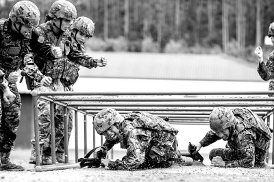 武警广西总队崇左支队官兵在进行通过地桩网训练。余海洋摄/光明图片
