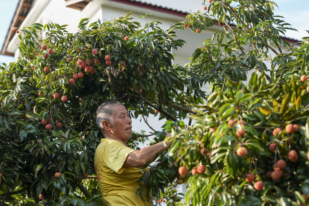 7月29日,重庆市涪陵区南沱镇睦和村村民在荔枝园内采摘新鲜的荔枝。