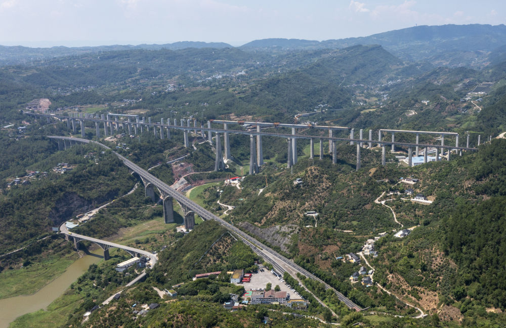 这是7月30日拍摄的重庆市涪陵区穿山越岭的高速公路和铁路(无人机照片)。