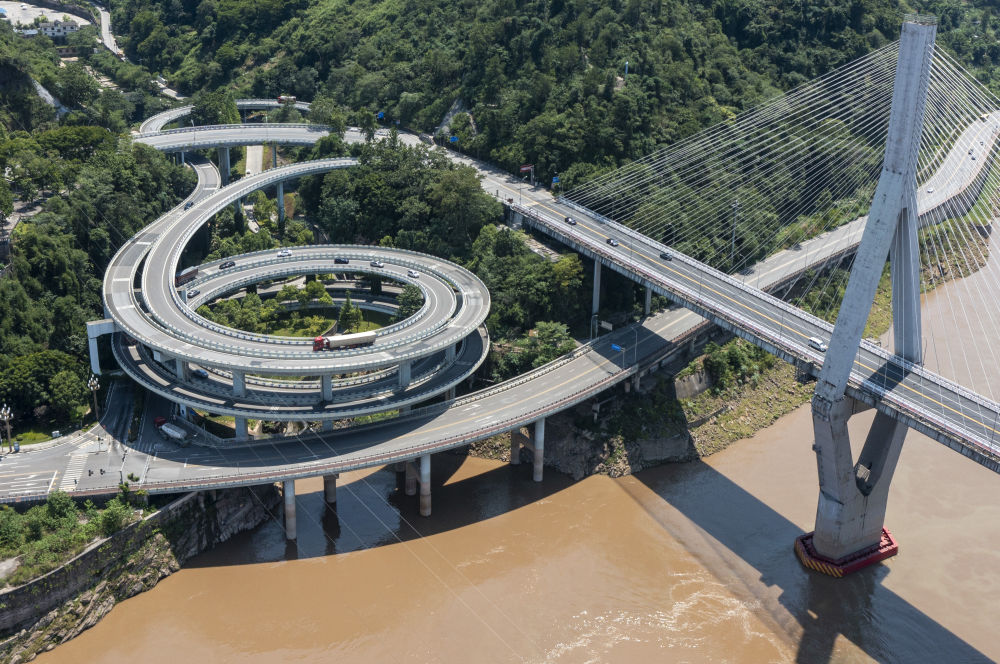这是7月30日拍摄的重庆市涪陵区涪陵长江大桥桥头的公路立体交通(无人机照片)。