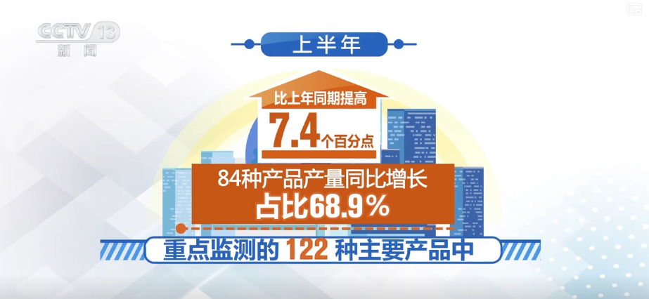 上半年,重点监测的122种主要产品中,84种产品产量同比增长,占比68.9%,比上年同期提高7.4个百分点。