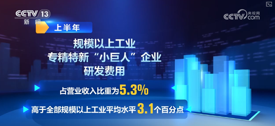 此外,中小企业创新能力不断提高。上半年,规模以上工业专精特新“小巨人”企业研发费用占营业收入比重为5.3%,高于全部规模以上工业平均水平3.1个百分点,发展新质生产力作用逐渐显现。
