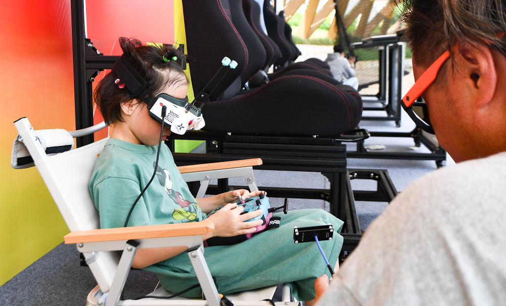 ↑2023年7月15日,来自上海的参赛选手虞恩宁在2023年中国无人机竞速公开赛(海南自贸港站)比赛中操作无人机。6岁的虞恩宁是本次参赛年纪最小的选手,她最终获得女子组第3名。
